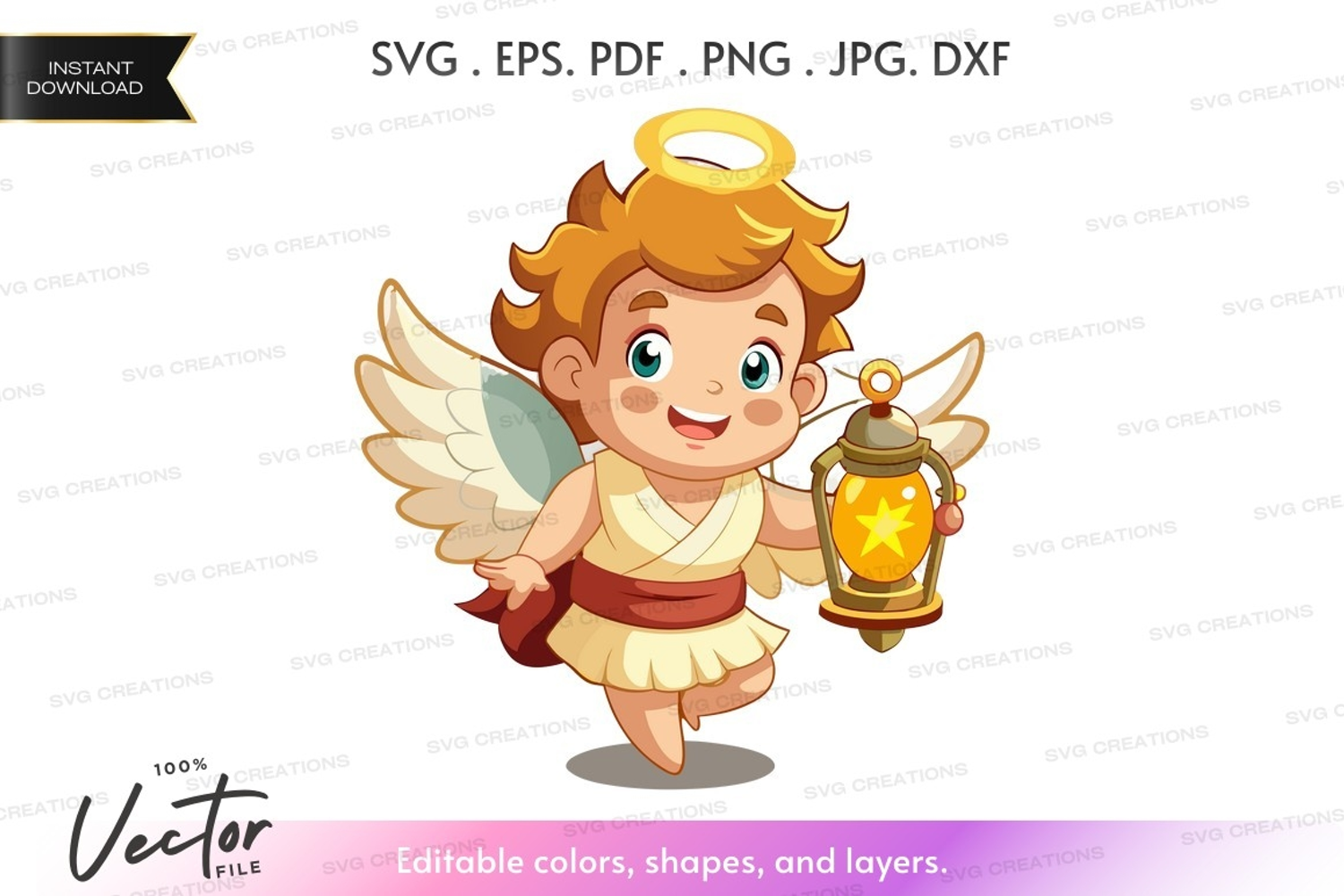 Child Illustration Cartoon Happy Angel Winged Lantern Halo Vector Silhouette Golden Hair