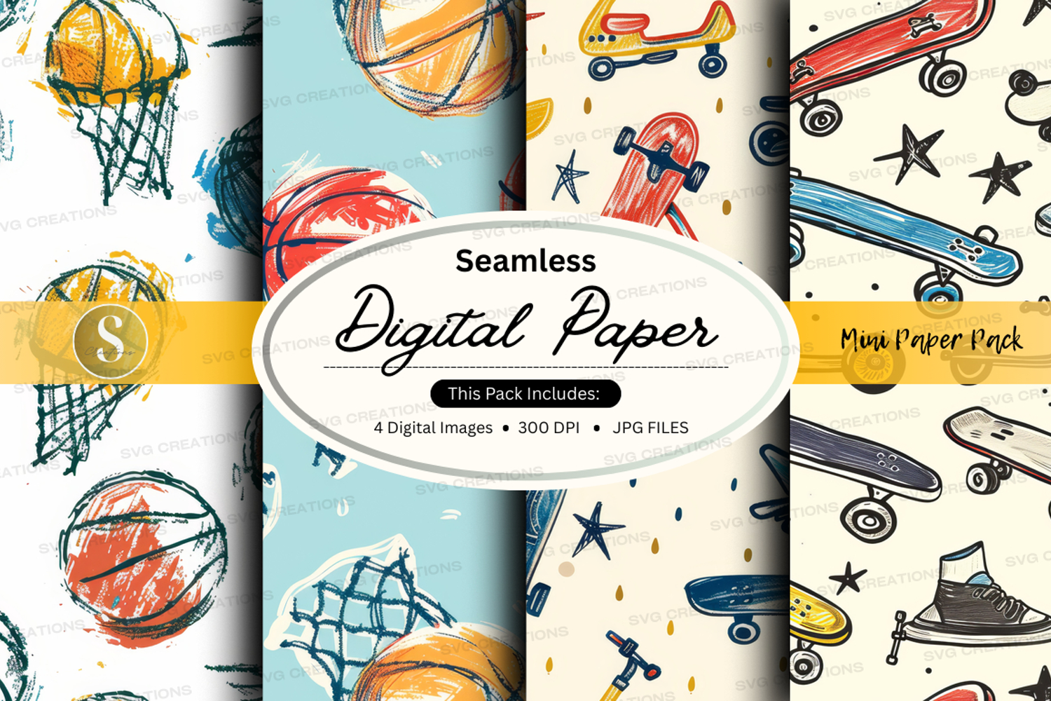 Sports Adventure Skateboard Digital Paper Seamless Basketball Airplane 300 Dpi Jpg Files