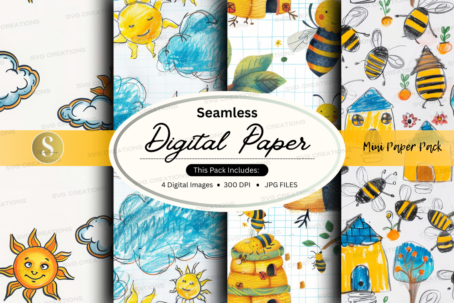 Sun Digital Paper Seamless Clouds Houses 300 Dpi Bees Jpg Files Summer Theme