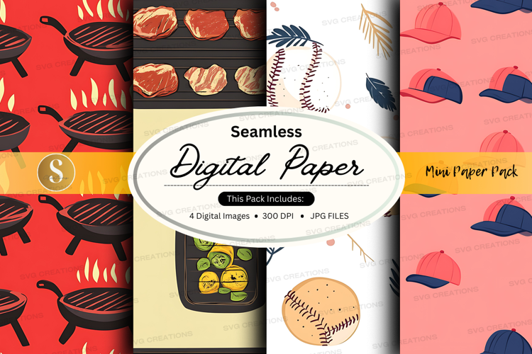 Baseball Summer Sports Digital Paper Seamless Barbecue Burgers Baseball Caps Mini Paper Pack