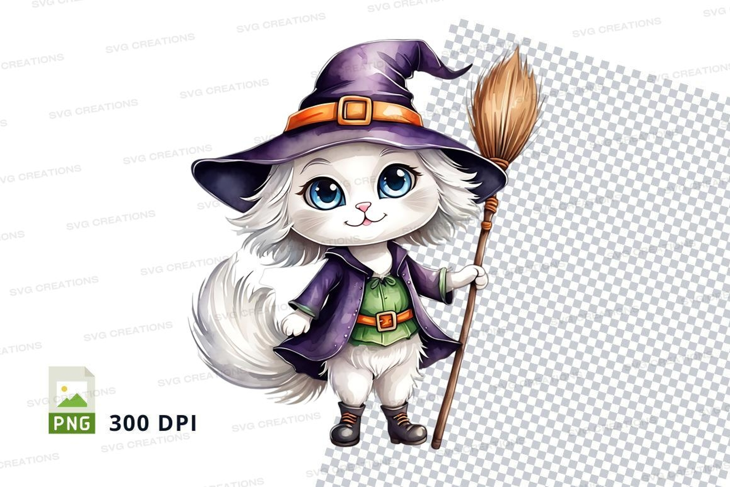 Cartoon Fantasy Halloween Green Witch Purple Orange Cat Costume Broomstick