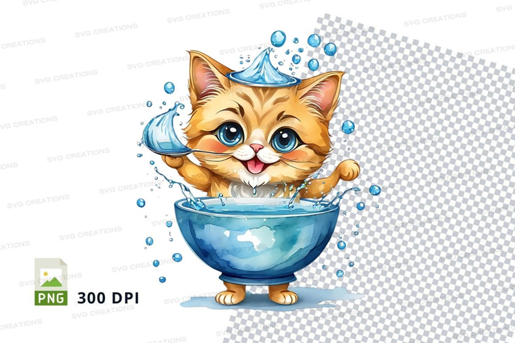 Cartoon Playful Water Blue Bubbles Bath Cat Kitten