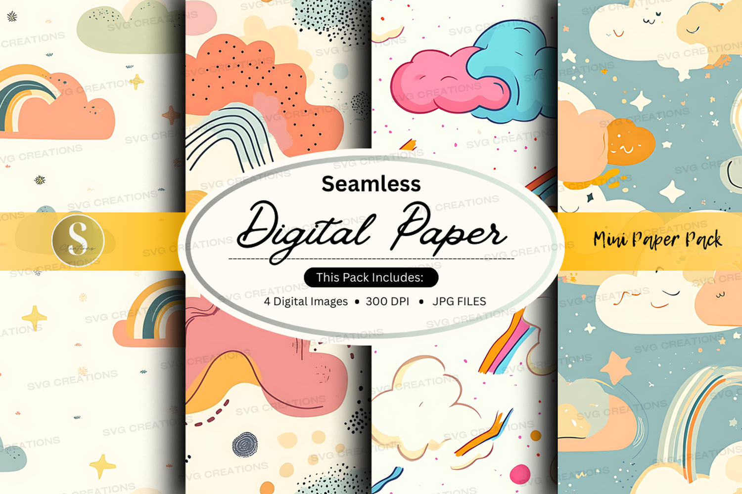 Craft Whimsical Digital Paper Seamless Scrapbooking Clouds Stars Card Making Rainbows