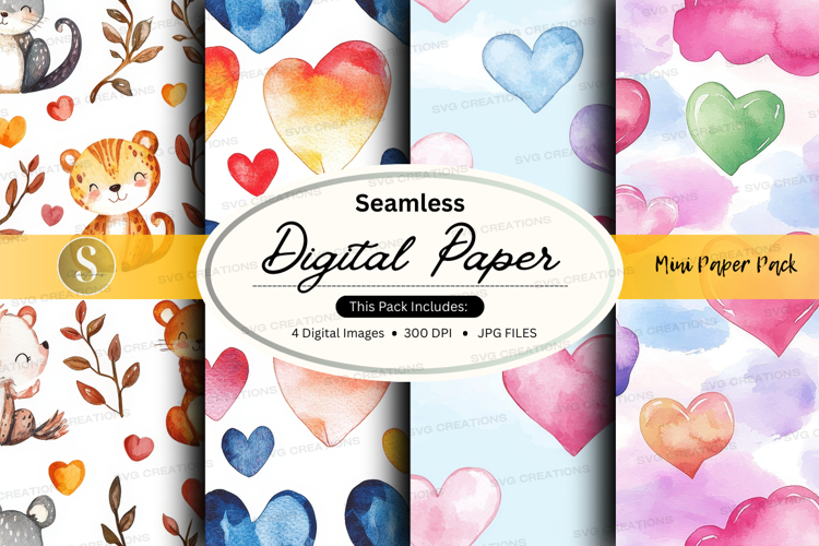 Digital Paper Scrapbooking Digital Art 300 Dpi Watercolor Hearts Pattern Paper Animal Illustrations Jpg Files