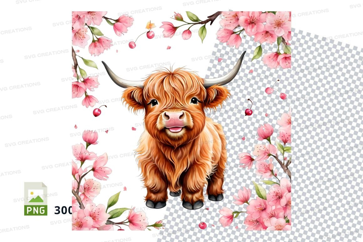 Cute highland cow with flowers clipart png example image 1