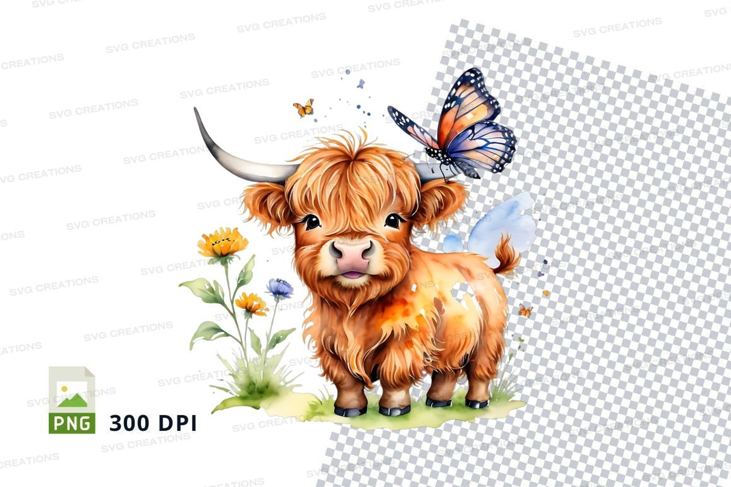 Cute highland cow with butterfly clipart png example image 1