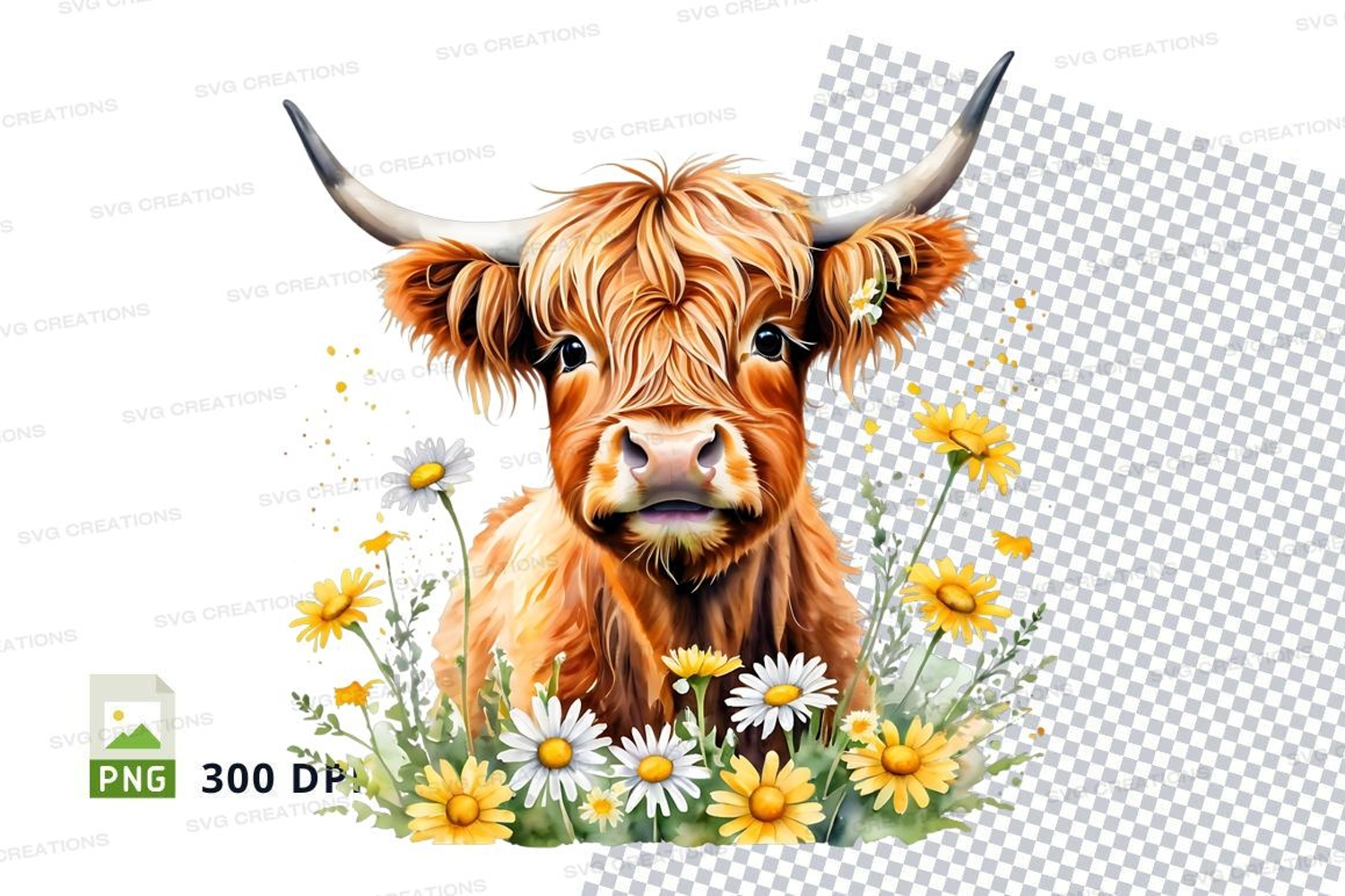 Cute highland cow with daisies clipart png example image 1