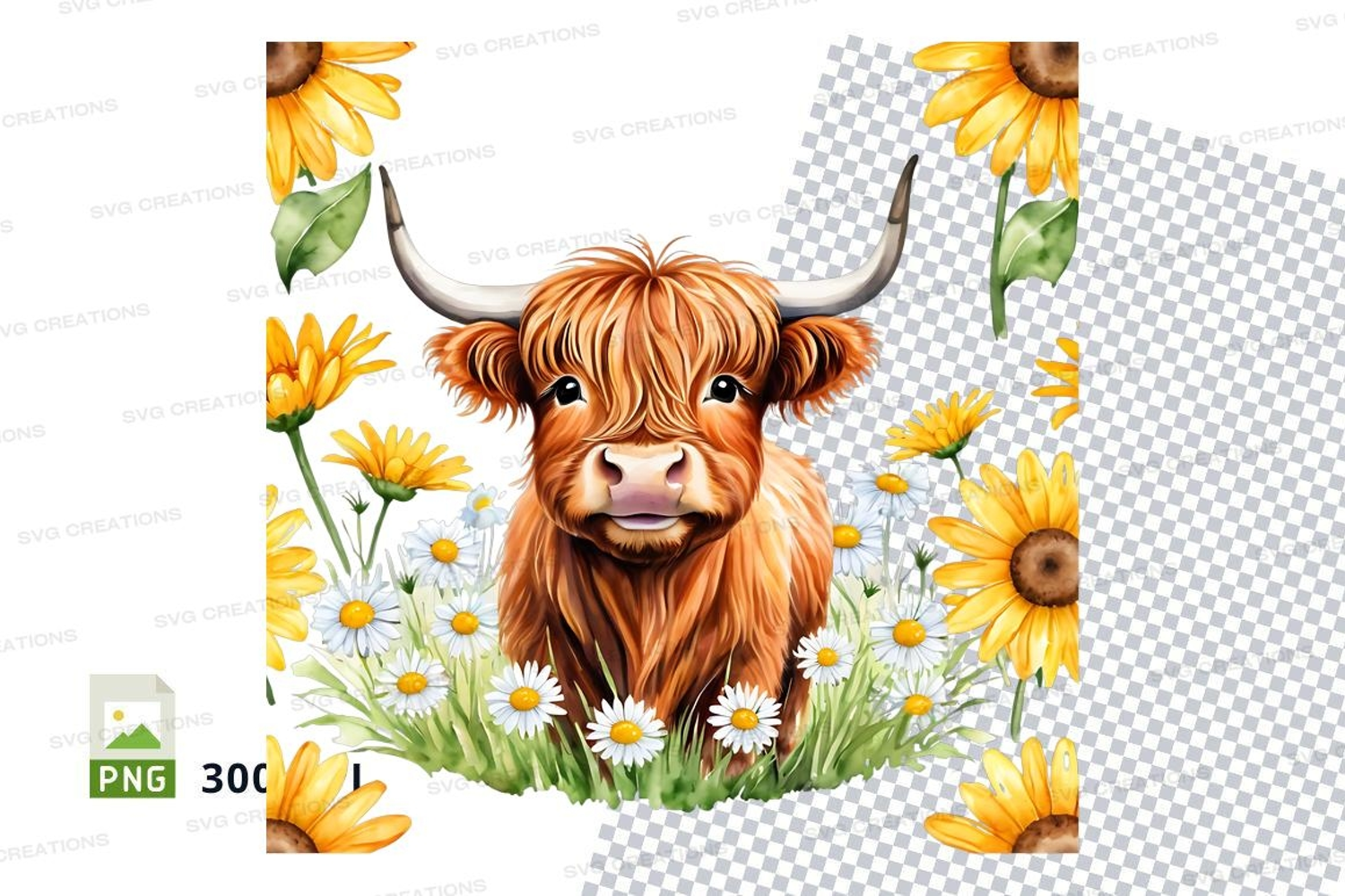 Illustration Animal Cute Nature Flowers Clipart Png Daisies Highland Cow Sunflowers