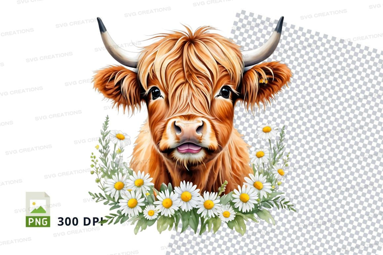 Cute highland cow with daisies clipart png example image 1