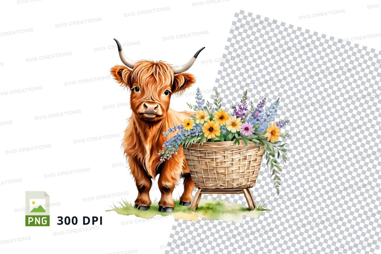 Illustration Animal Nature Flowers Lavender Clipart Cow Basket Highland Cow Sunflowers