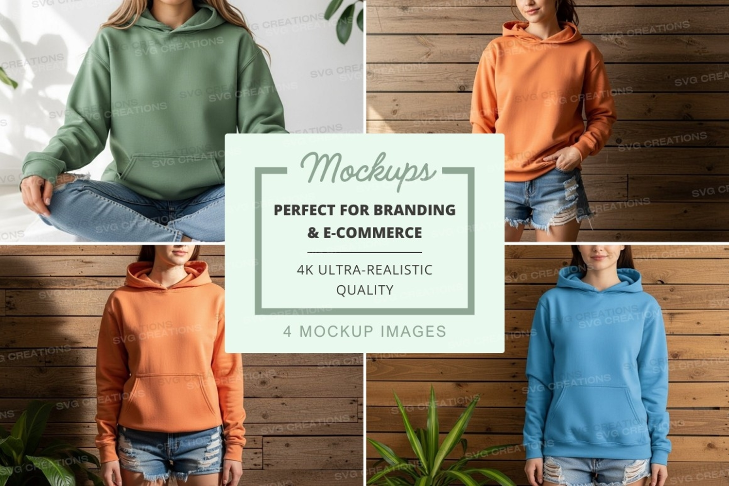 Mockup Rustic Background Hoodie Models Wooden Wall Casual Wear Blue Hoodie Green Hoodie Orange Hoodie