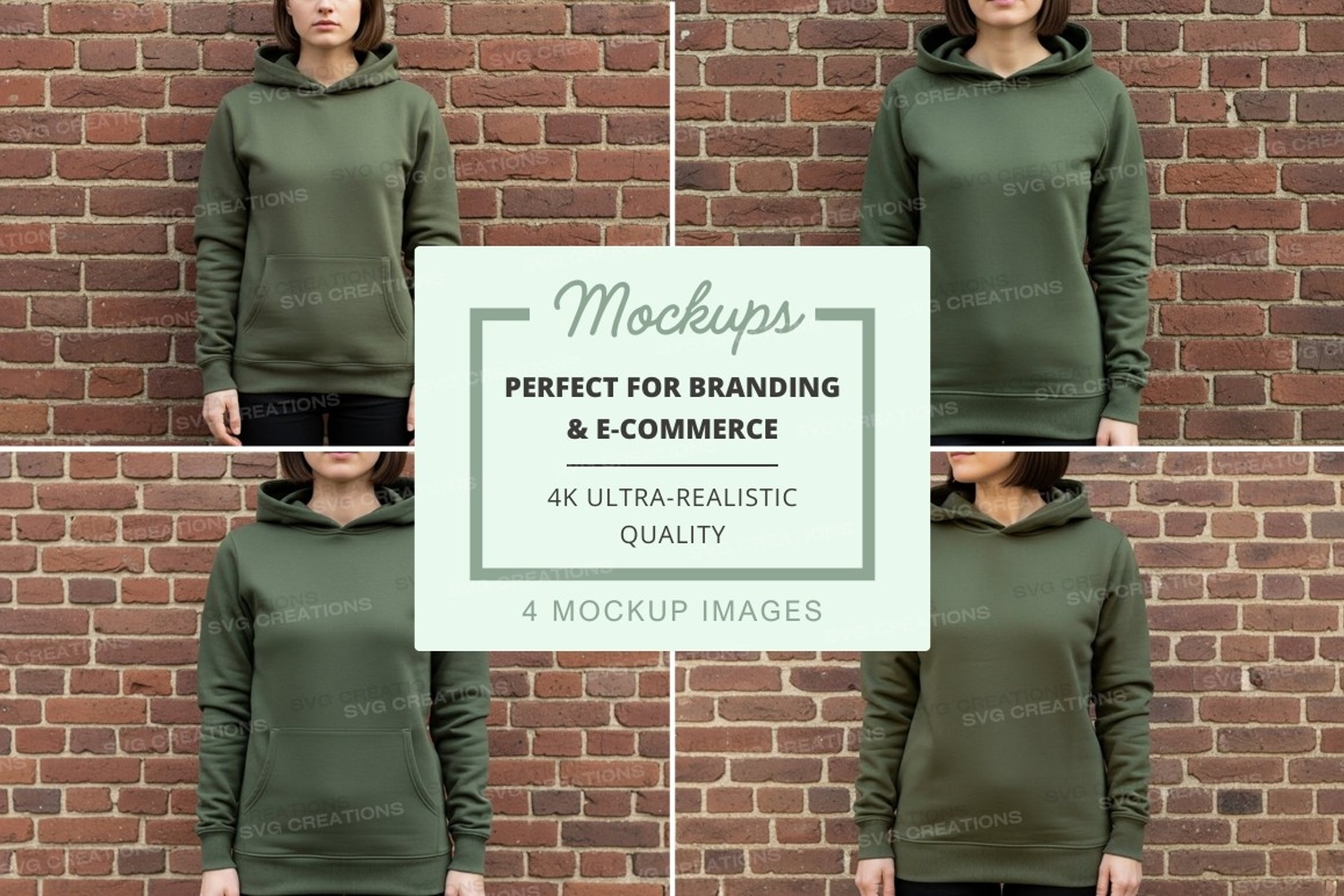 Mockup Front View Side View Back View Hoodie Brick Wall Olive Green Hooded Sweatshirt Drawstring Hood Kangaroo Pocket