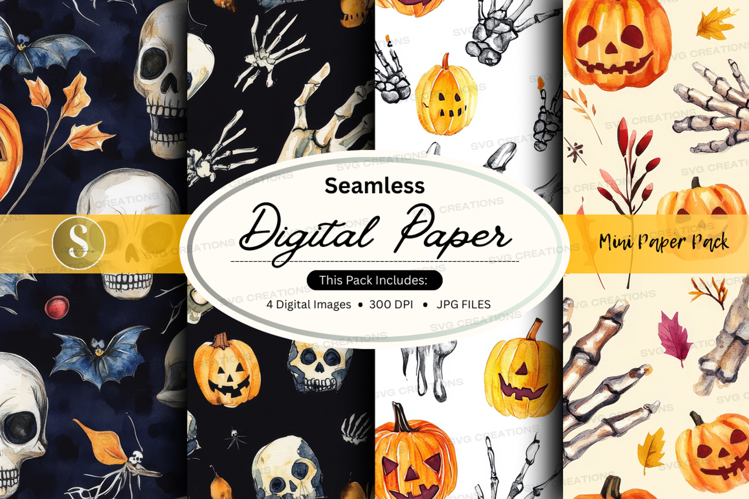 Halloween Digital Paper Seamless Jpeg 300 Dpi Bats Skulls Skeleton Hands Jack-o'-lanterns