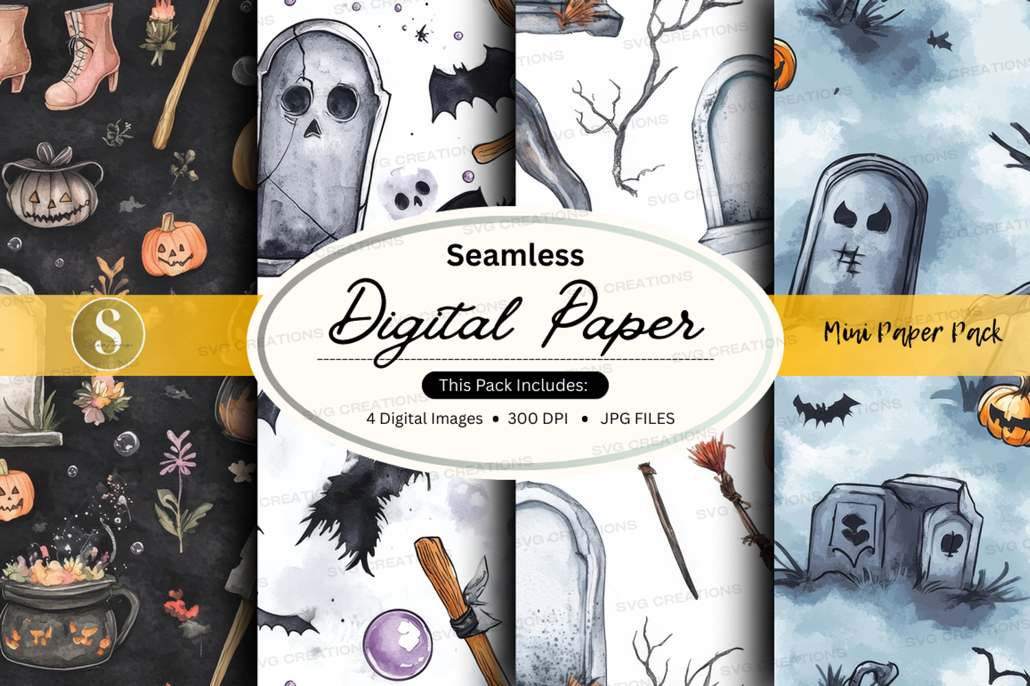 Halloween Digital Paper Seamless Pattern High Resolution Pumpkins 300 Dpi Bats Jpg Files Ghosts Tombstones
