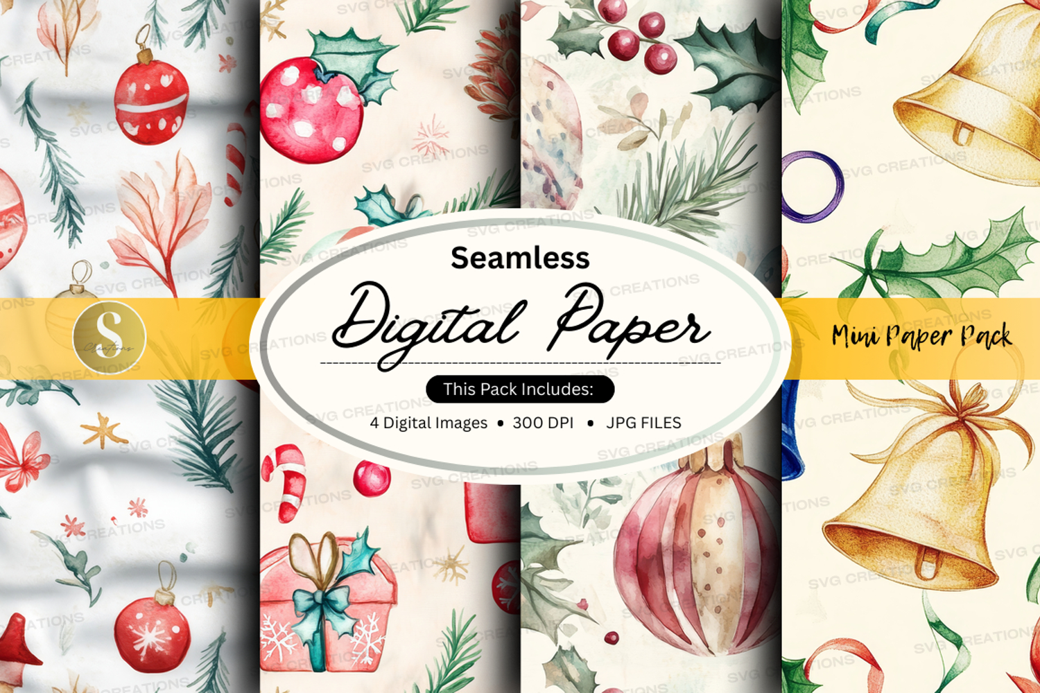Ornaments Holiday Christmas Digital Paper Seamless Patterns Holly Jpeg Festive Bells 300 Dpi