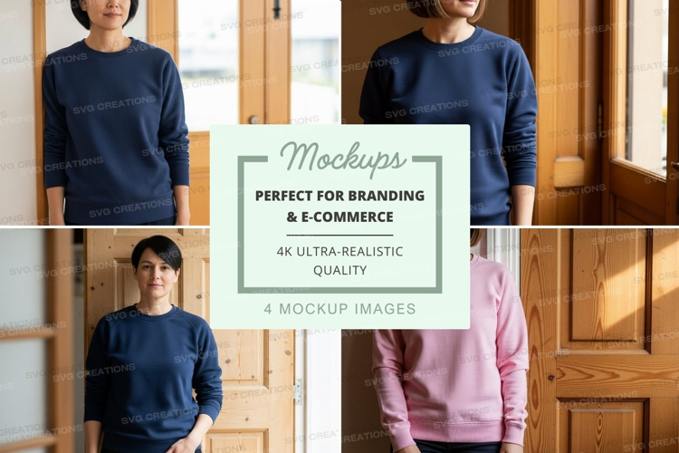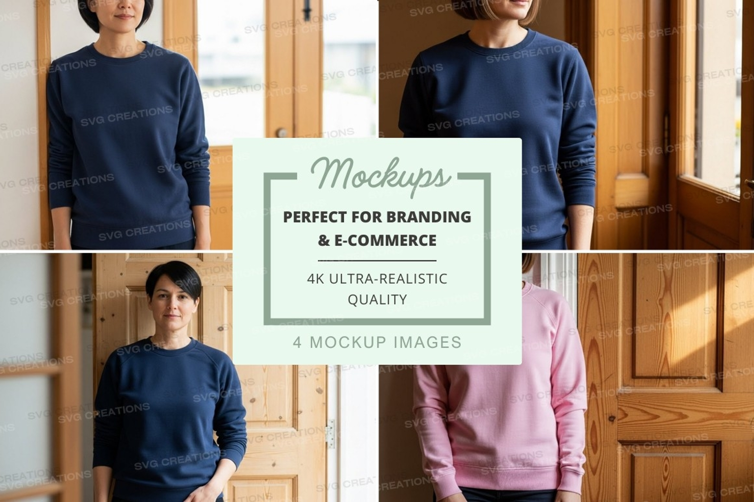 Mockup Apparel Model Sweatshirt Light Pink Dark Blue Indoor Setting Wooden Cabinet