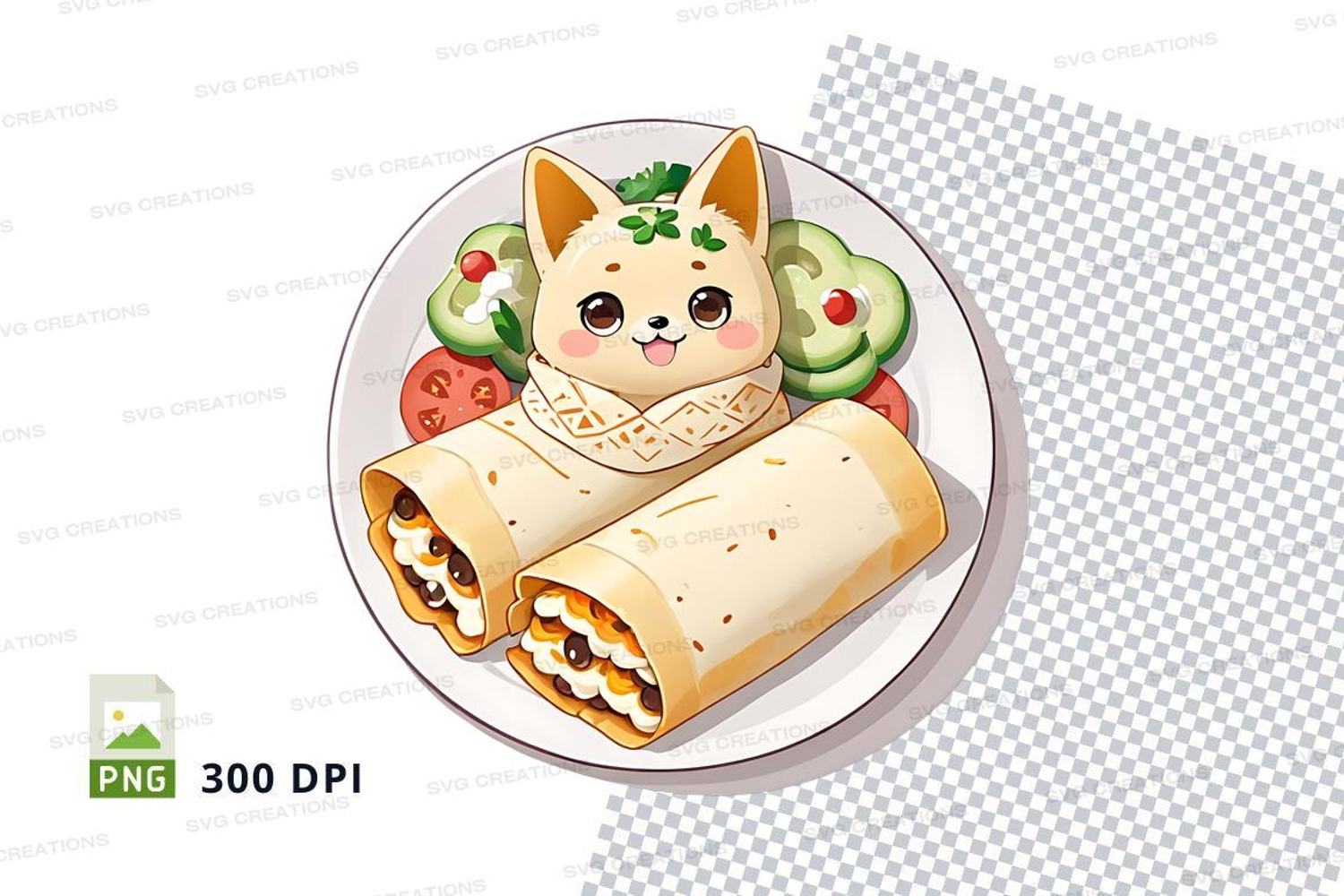 Illustrated burrito with cute cat character
