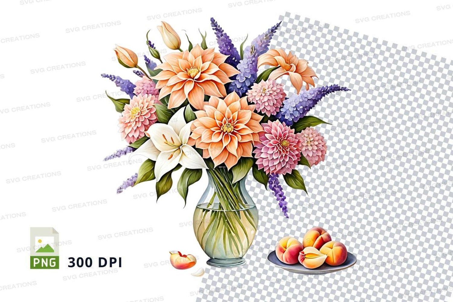 Floral bouquet in vase with fruits png example image 1