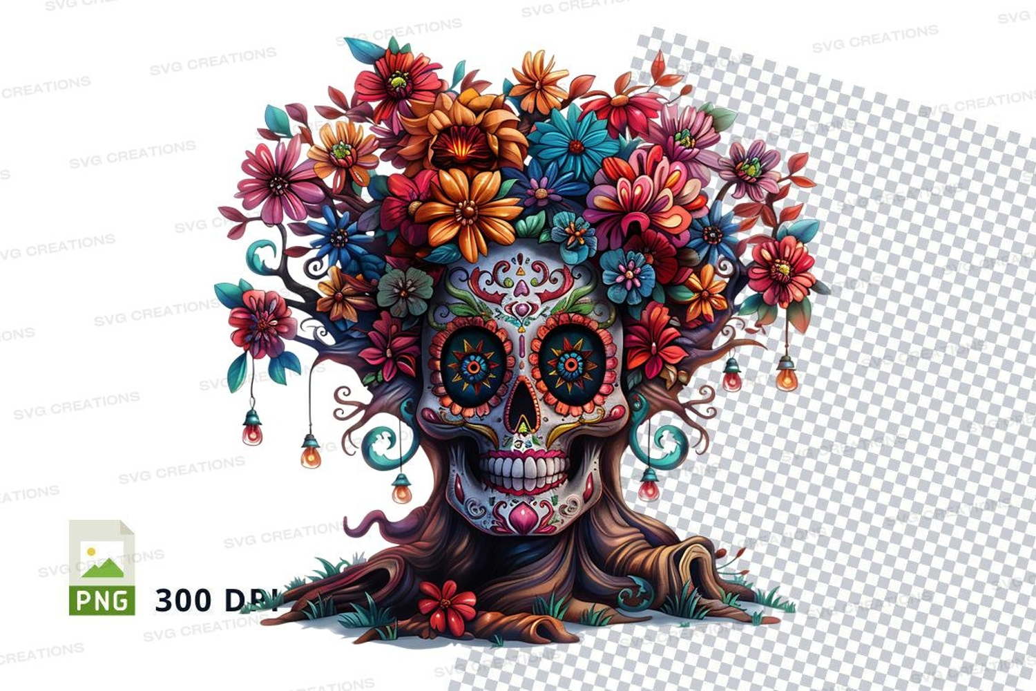 Colorful sugar skull with flowers clipart png example image 1