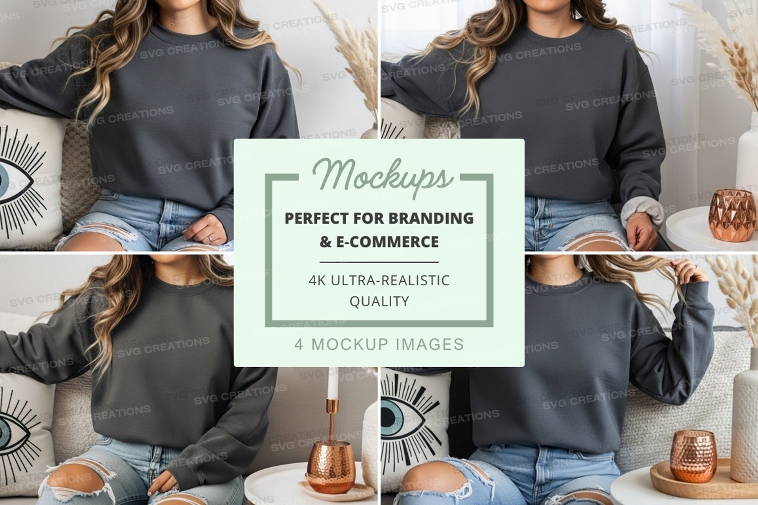 Mockup Collage Model Jeans Decor Indoor Sweatshirt Dark Gray Crew Neck