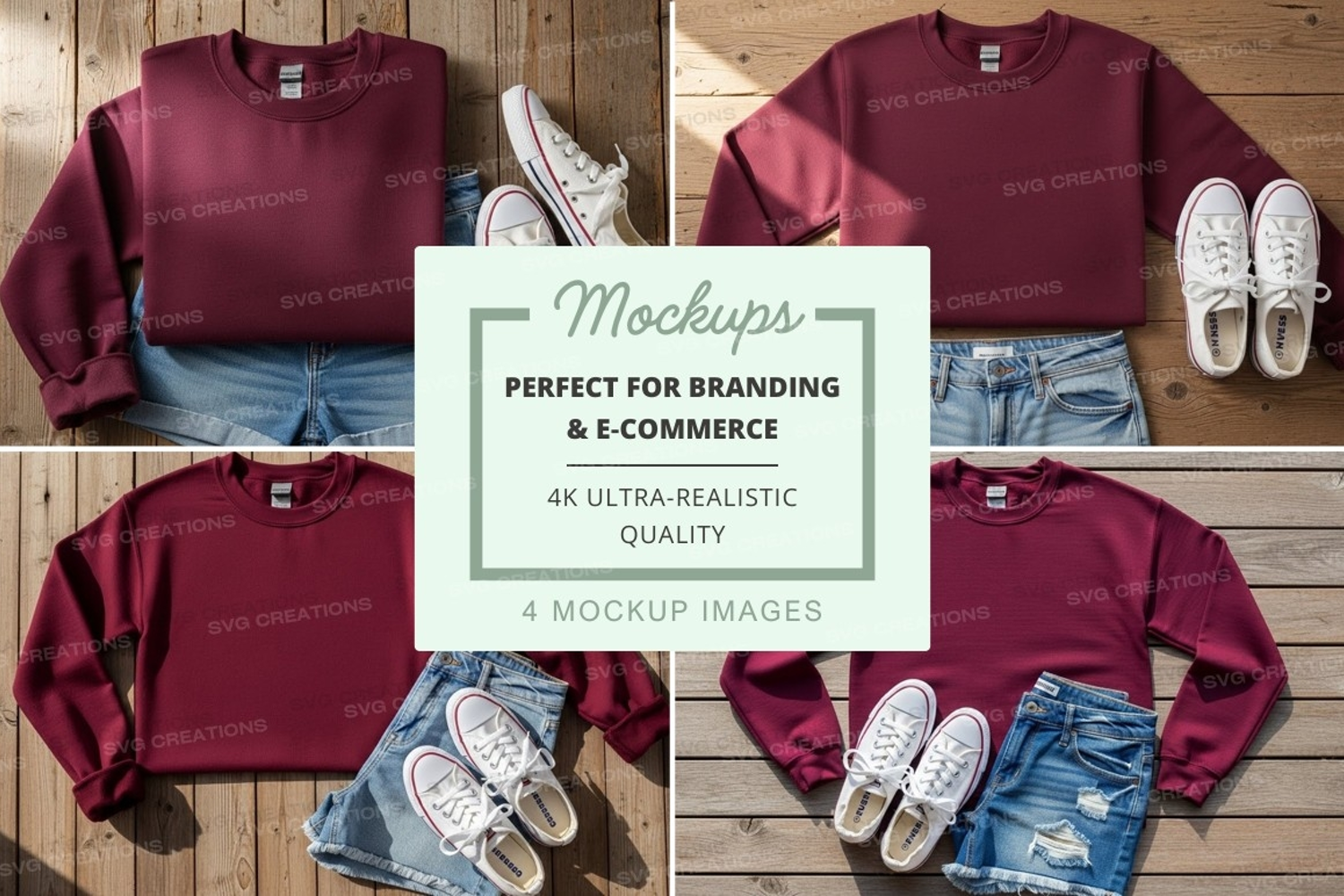 Fashion Mockup Maroon Sweatshirt Denim Shorts White Sneakers Wooden Surface