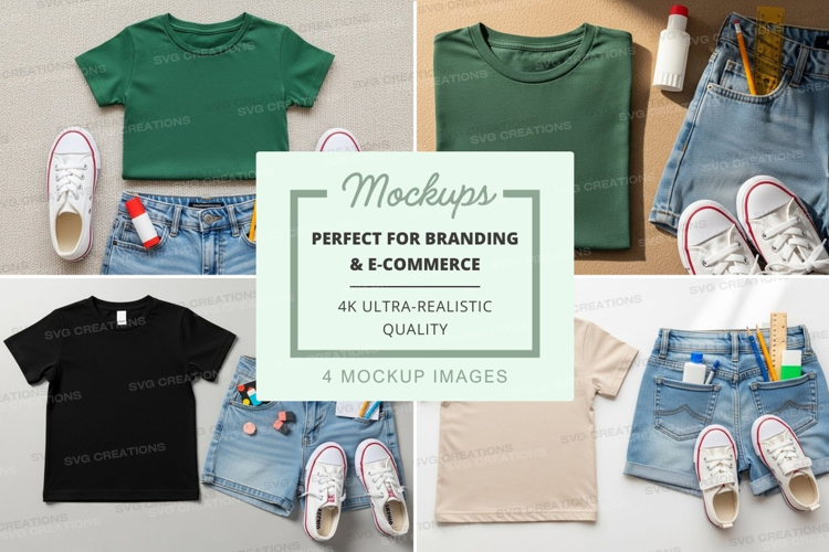 T-shirt Mockup Flat Lay Children's Clothing Denim Shorts White Sneakers