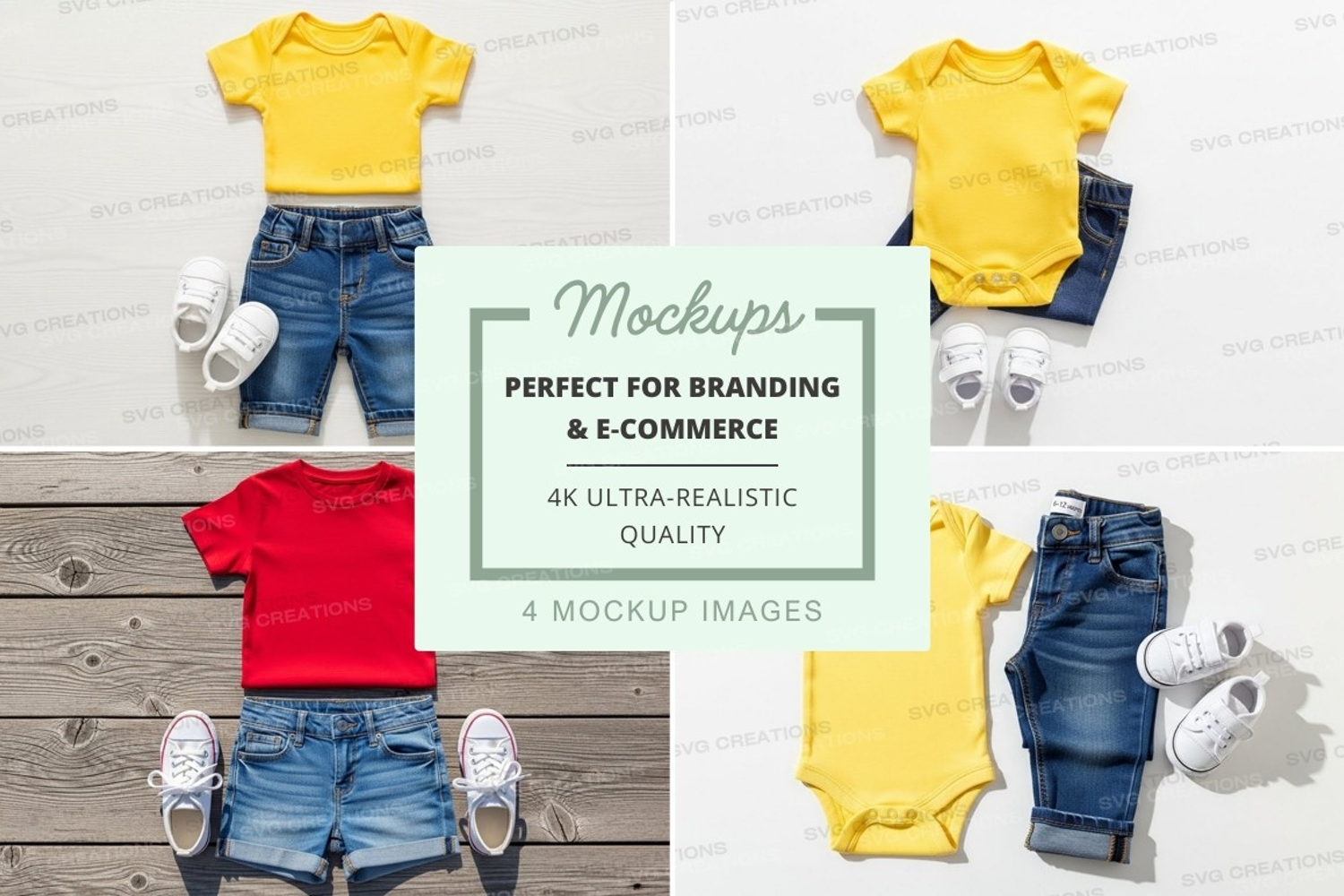 Similar Design Products to Baby clothing mockup - yellow and red onesies with denim sho