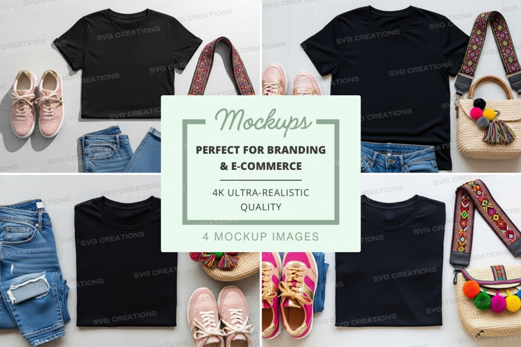 T-shirt Mockup Bag Jeans Accessories Flat Lay Shoes Decorative Items Black T-shirt