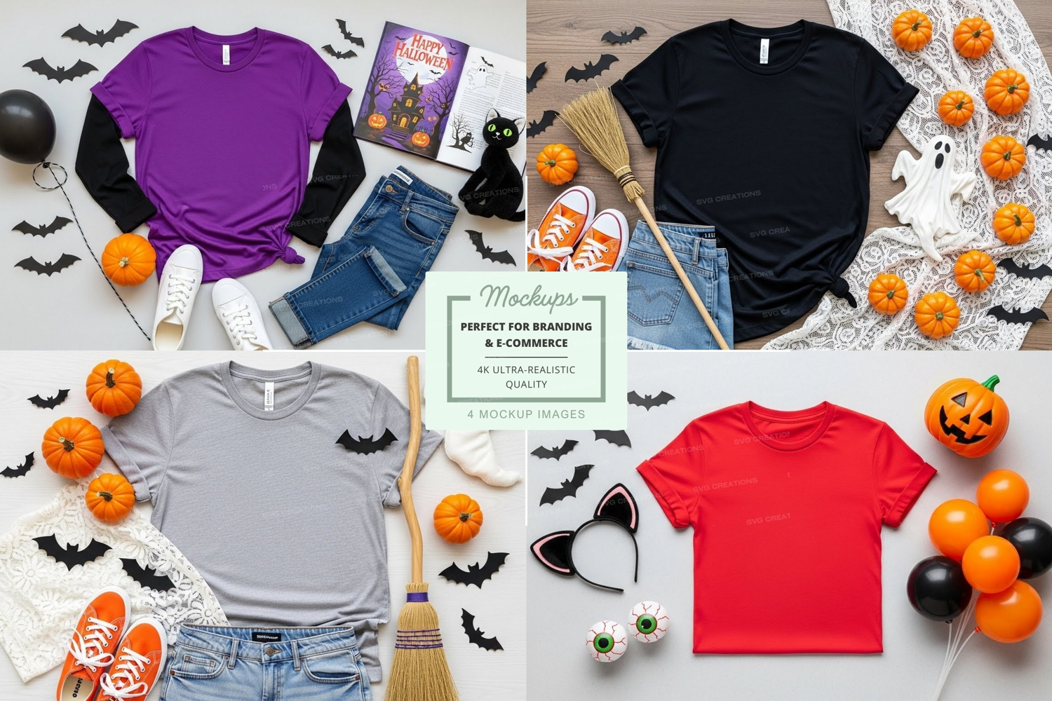 Halloween Black T-shirt Mockup Purple Bat Jeans Red Pumpkin Gray