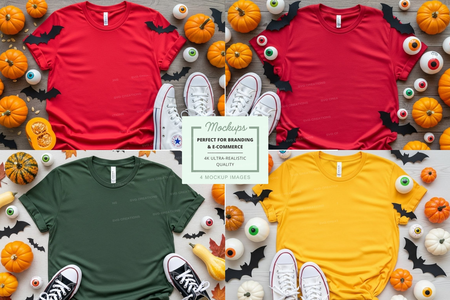 Halloween T-shirt Mockup Bat Pumpkin Eyeball White T-shirt Green T-shirt Red T-shirt Yellow T-shirt