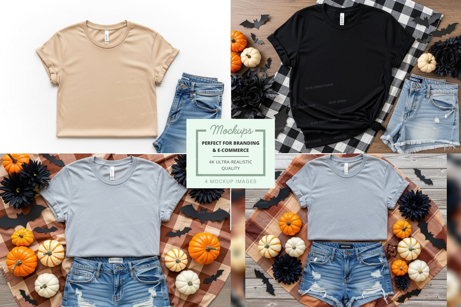 Pumpkins T-shirt Mockup Black Flowers Denim Shorts Black T-shirt Gray T-shirt Autumn Themed Beige T-shirt