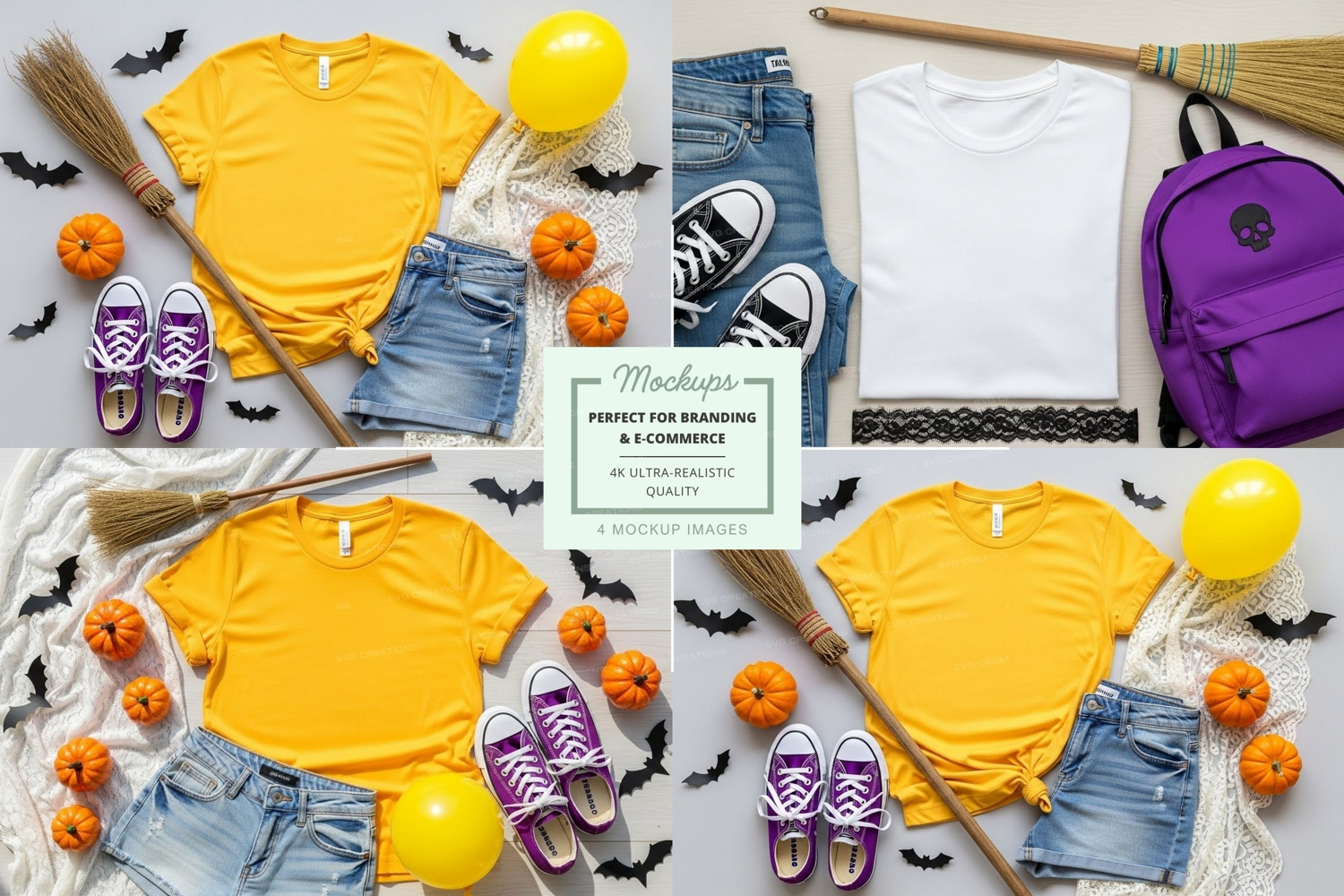 Halloween T-shirt Mockup Yellow Bat White Pumpkin Broom Balloon Denim Shorts