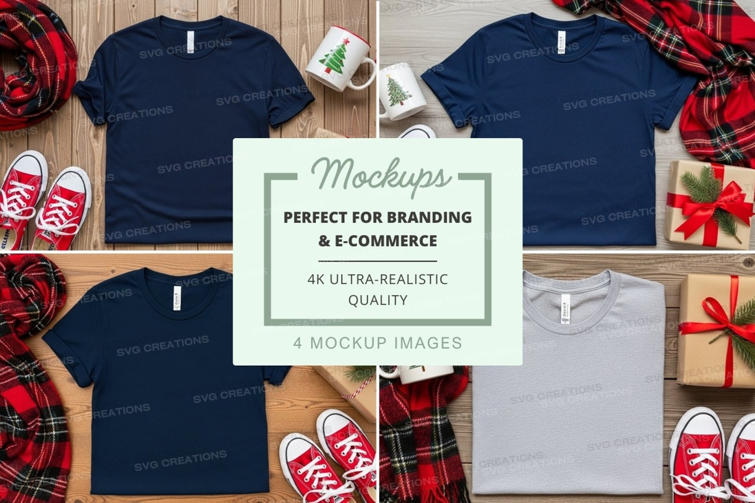 Holiday T-shirt Christmas Mockup Mug Sneakers Wooden Background Gift Boxes Plaid Scarf