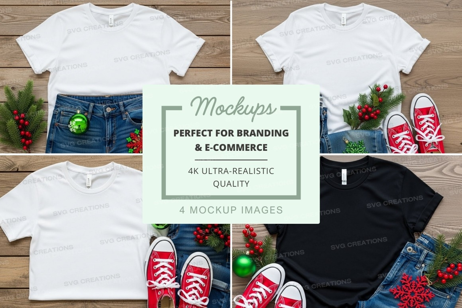Holiday Black T-shirt Christmas Mockup Decoration White Red Sneakers Denim Shorts