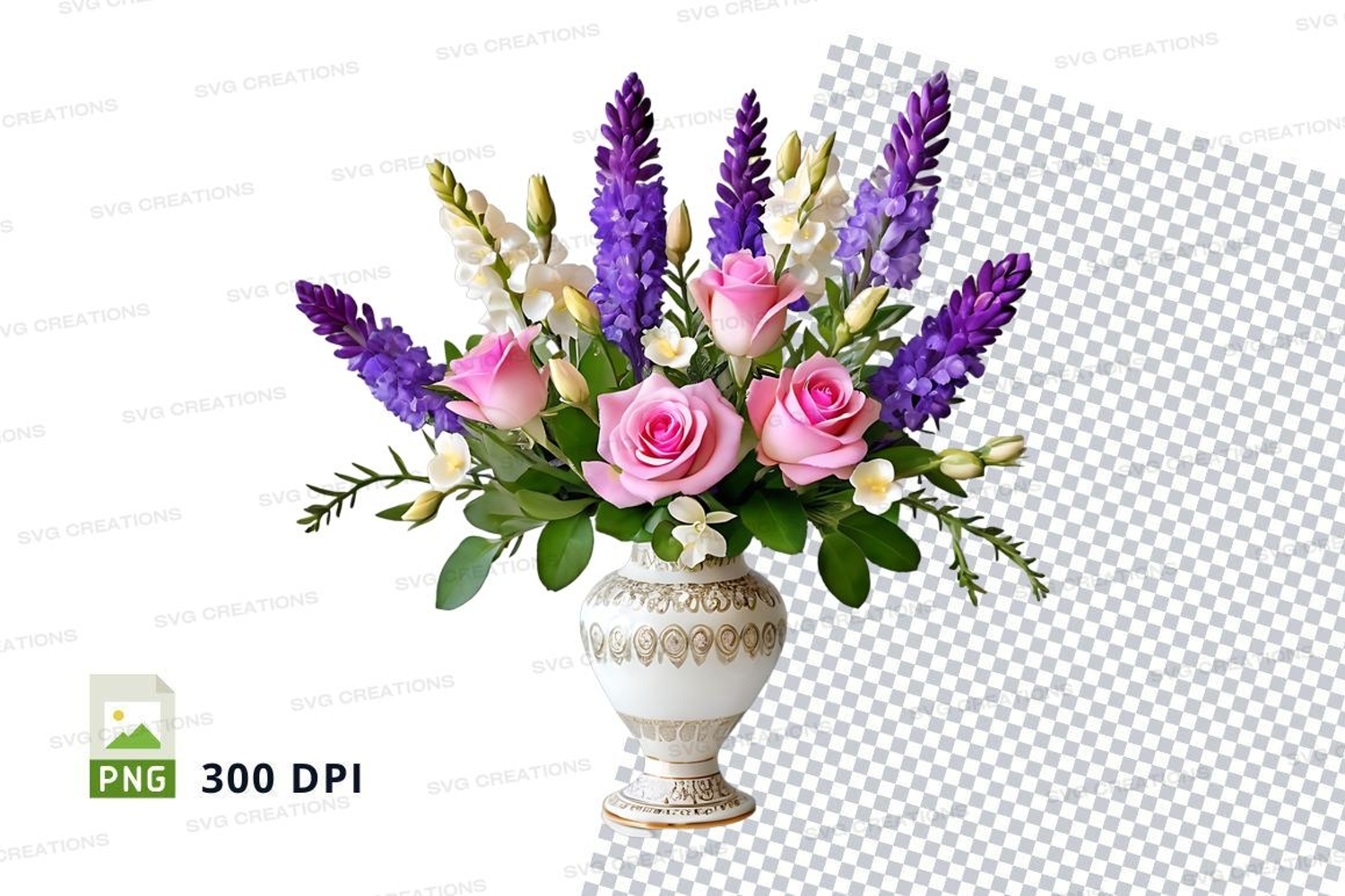 Mockup Purple Flowers Vase Flower Bouquet 300 Dpi Pink Roses Green Foliage High-resolution Png Ornate Vase