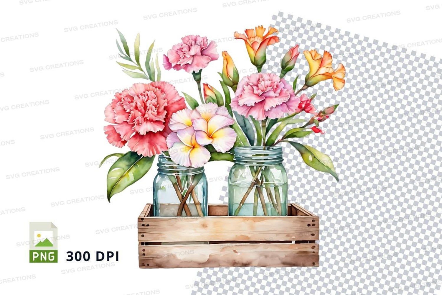 Watercolor Flowers Pink Flowers Bouquet Vase 300 Dpi Mason Jars Blue And White Wooden Crate Checkered Background