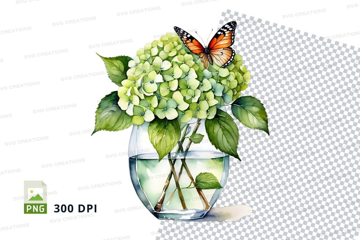 Watercolor hydrangea and butterfly in vase clipart png example image 1