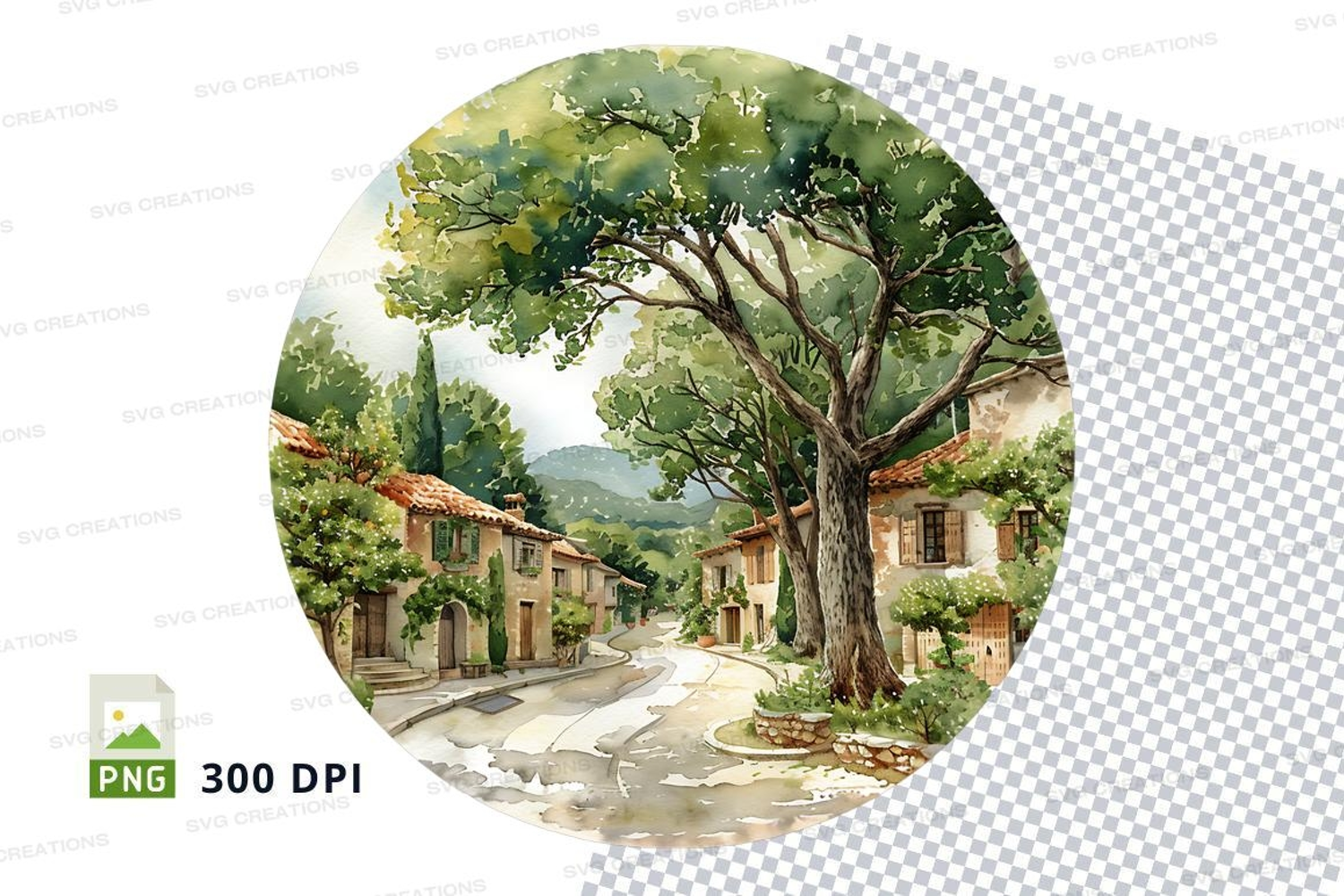 Illustration Watercolor Tree Street Clipart Png Buildings Greenery Village 300 Dpi