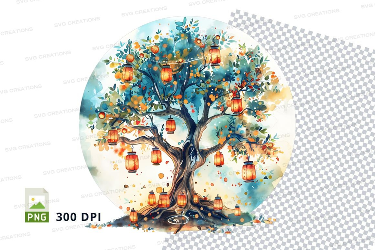 Watercolor tree with hanging lanterns clipart png example image 1