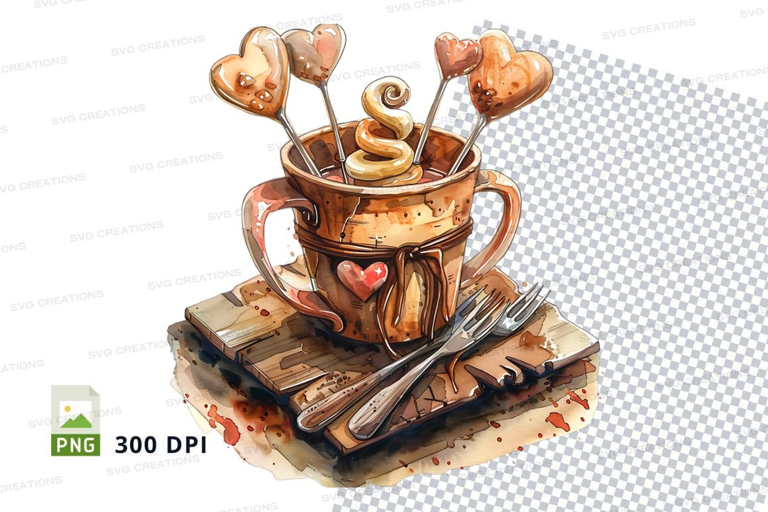 Heart Wooden Table Mug Fork Spoon Ceramic Lollipop Clear Glass Iris Flowers