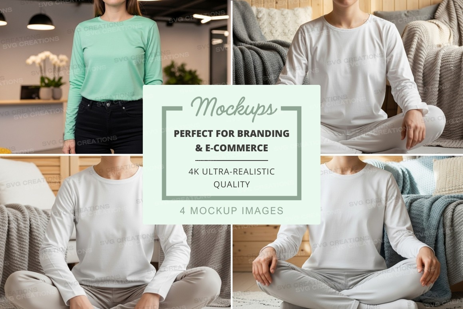 Long sleeve t-shirt mockup featuring four women in a relaxed
