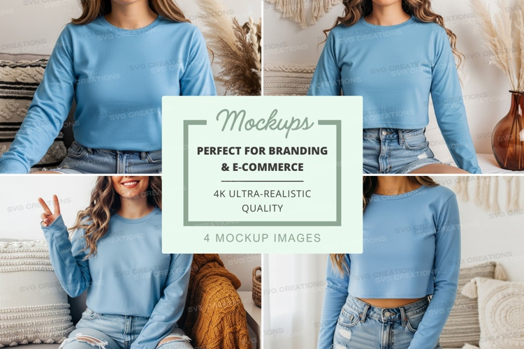 Fashion Mockup Model Light Blue Long Sleeve Crop Top Casual Wear