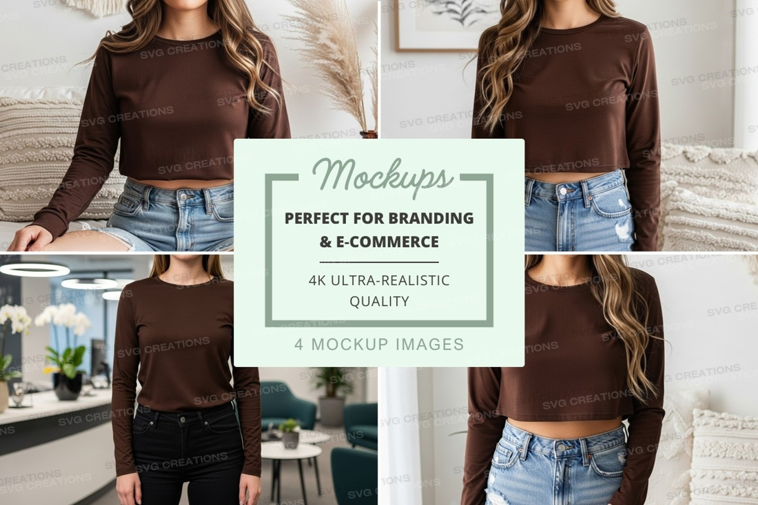 Fashion Mockup Brown Jeans Long Sleeve Denim Shorts Crop Top