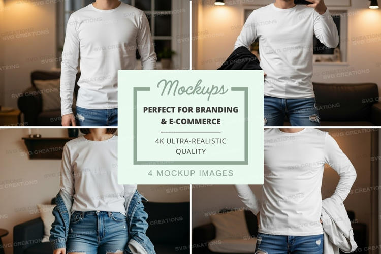 T-shirt Mockup Jeans White Long Sleeve Casual Wear Indoor Setting