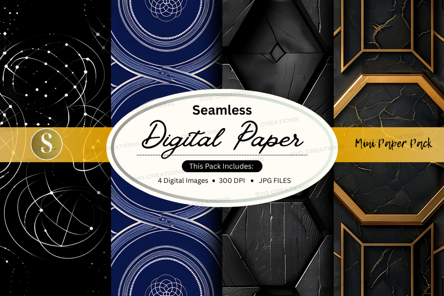 Geometric Gold Black Patterns Digital Paper Design Elements Seamless Crafting Hexagons