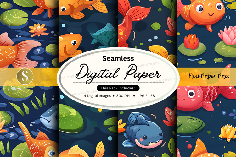 Colorful Digital Paper Seamless Pattern Aquatic Fish Pattern Dark Blue Background Lily Pads