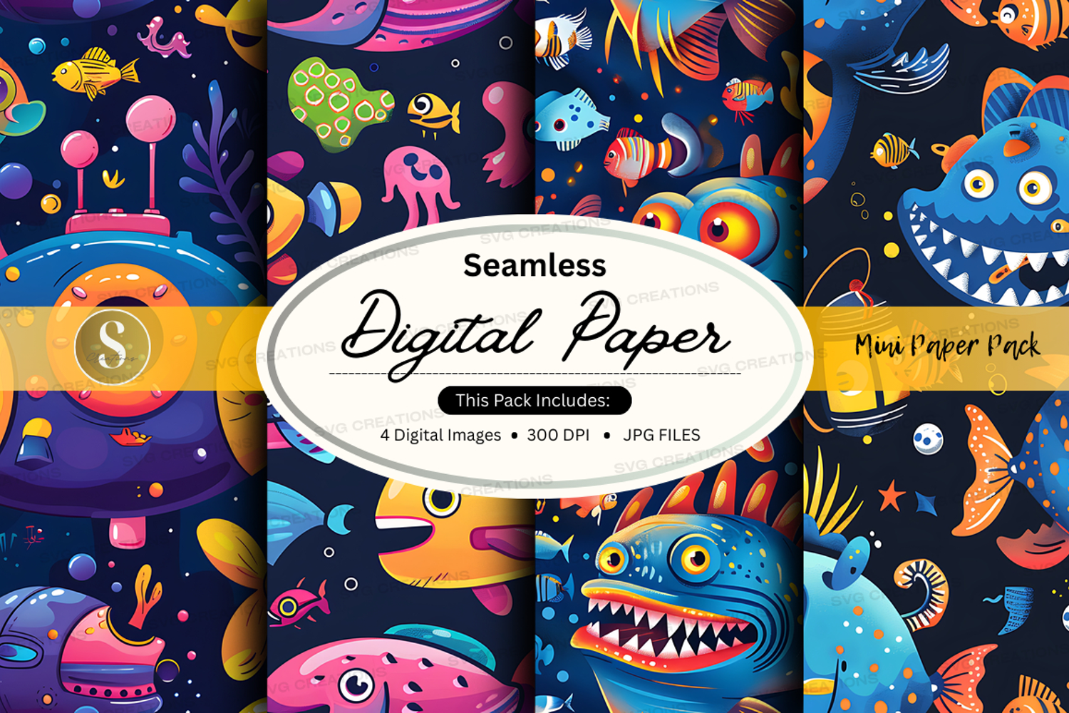 Seamless digital paper with underwater creatures pattern example image 1