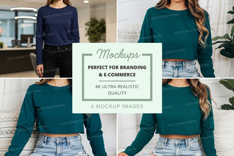 Mockup Teal Navy Blue Long Sleeve Fashion Model Denim Shorts Crop Top