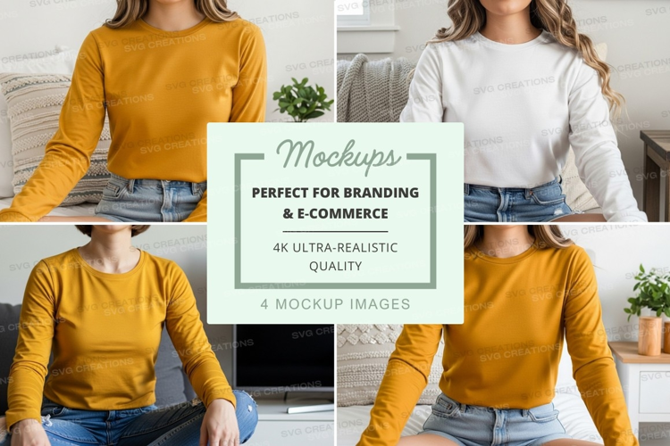 T-shirt Mockup Yellow White Computer Desk Plants Indoor Long Sleeve Casual Wear