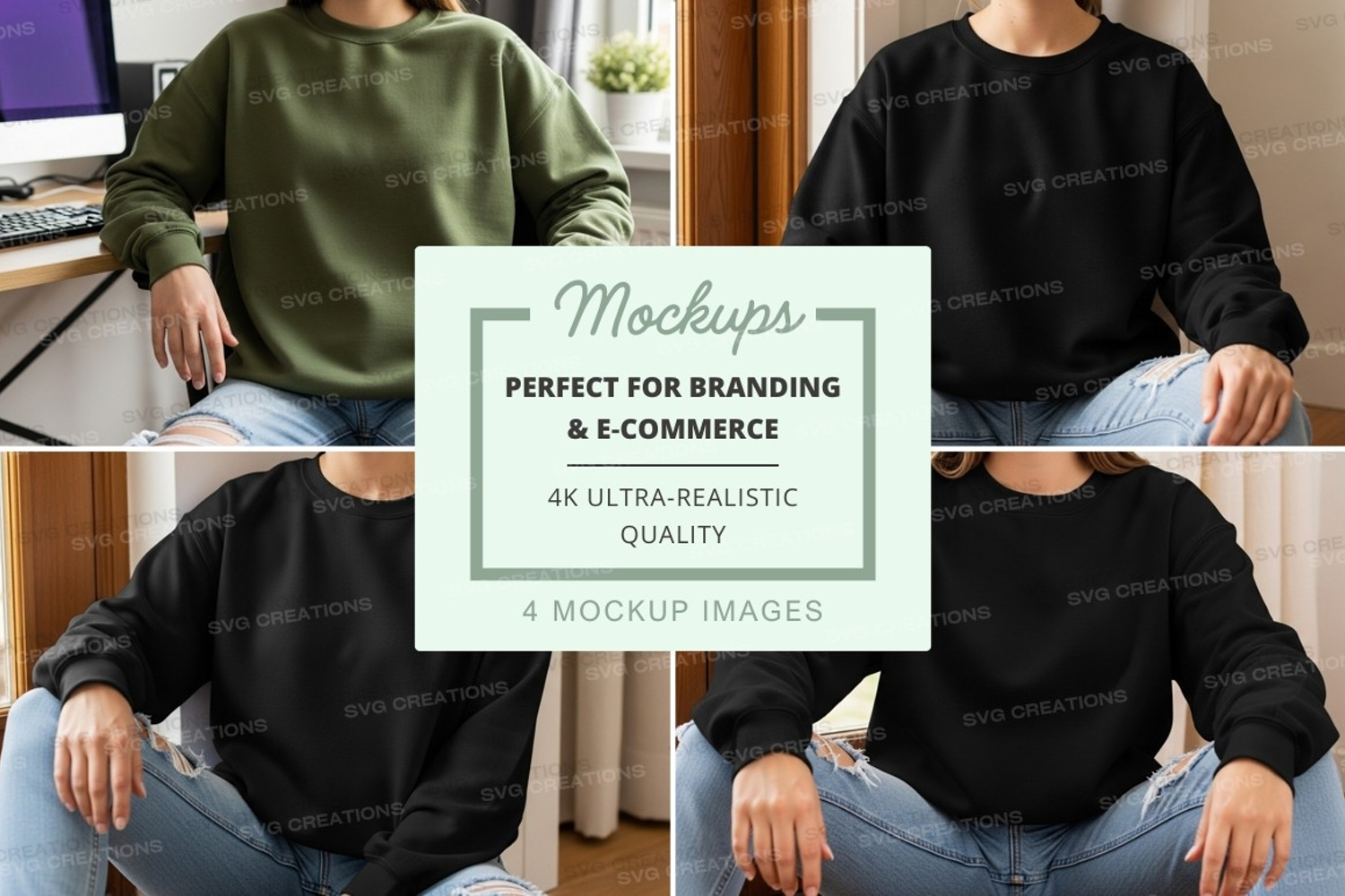 Black Green Mockup Apparel Model Front View Side View Sweatshirt Crew Neck Oversized Fit
